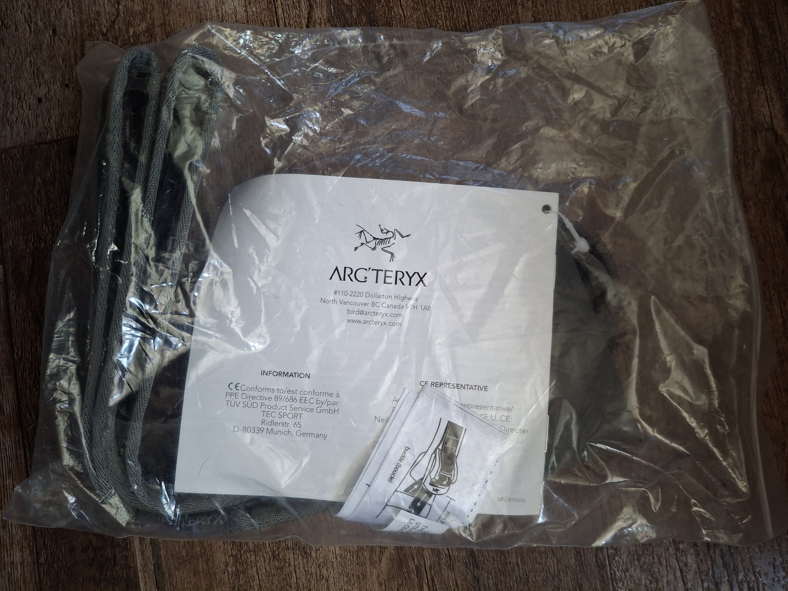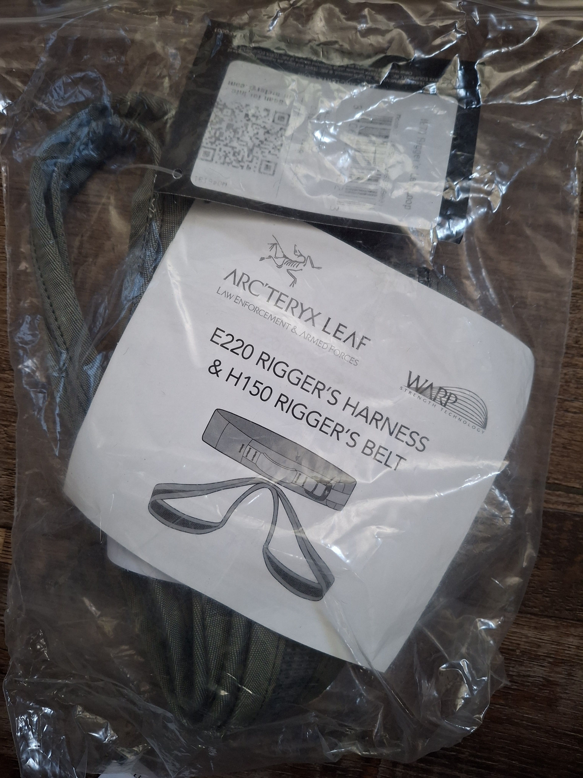 ARC’TERYX E220 Riggers Harness. New in factory package. This is the seat sling only, NO riggers belt. Sling are marked size small, I’m 6’1″ 205 and these work quite well for me. These fold up small and fit in pretty much any pocket, great tactical item to have to go with any riggers belt.
