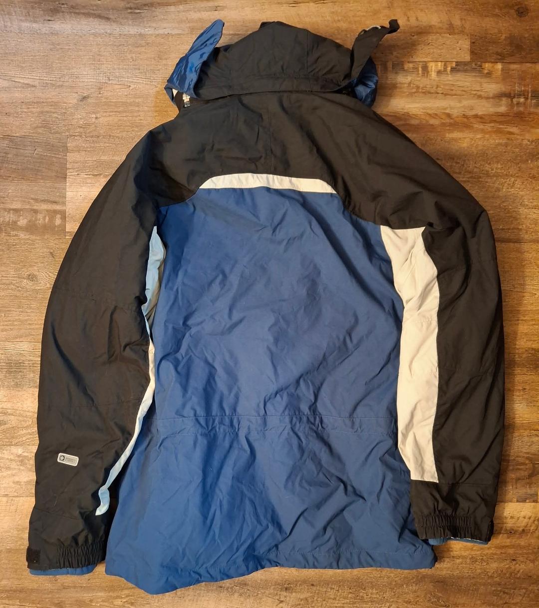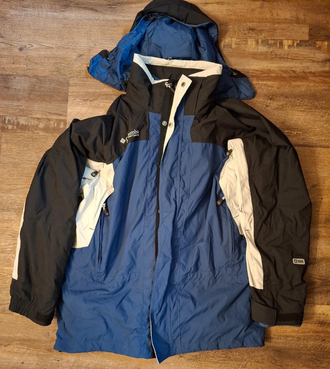 Columbia 3 in 1 Fire Ridge Ski Parka. Excellent condition. Has removable hood and slip-out fleece jacket liner. Color Blue, White, Black. Size XLarge.