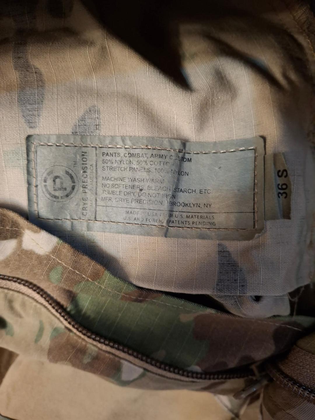 Crye Precision G2 Pants, Combat, Army Custom. Good to very good condition. Has one small hole on left knee pad flap. Please see pictures. Size 36S.