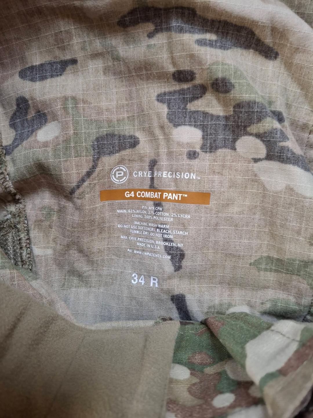 Crye Precision G4 Combat Pants. Good to very good condition, with one professional repair to crotch, very little fading. See pictures. Size 34R.