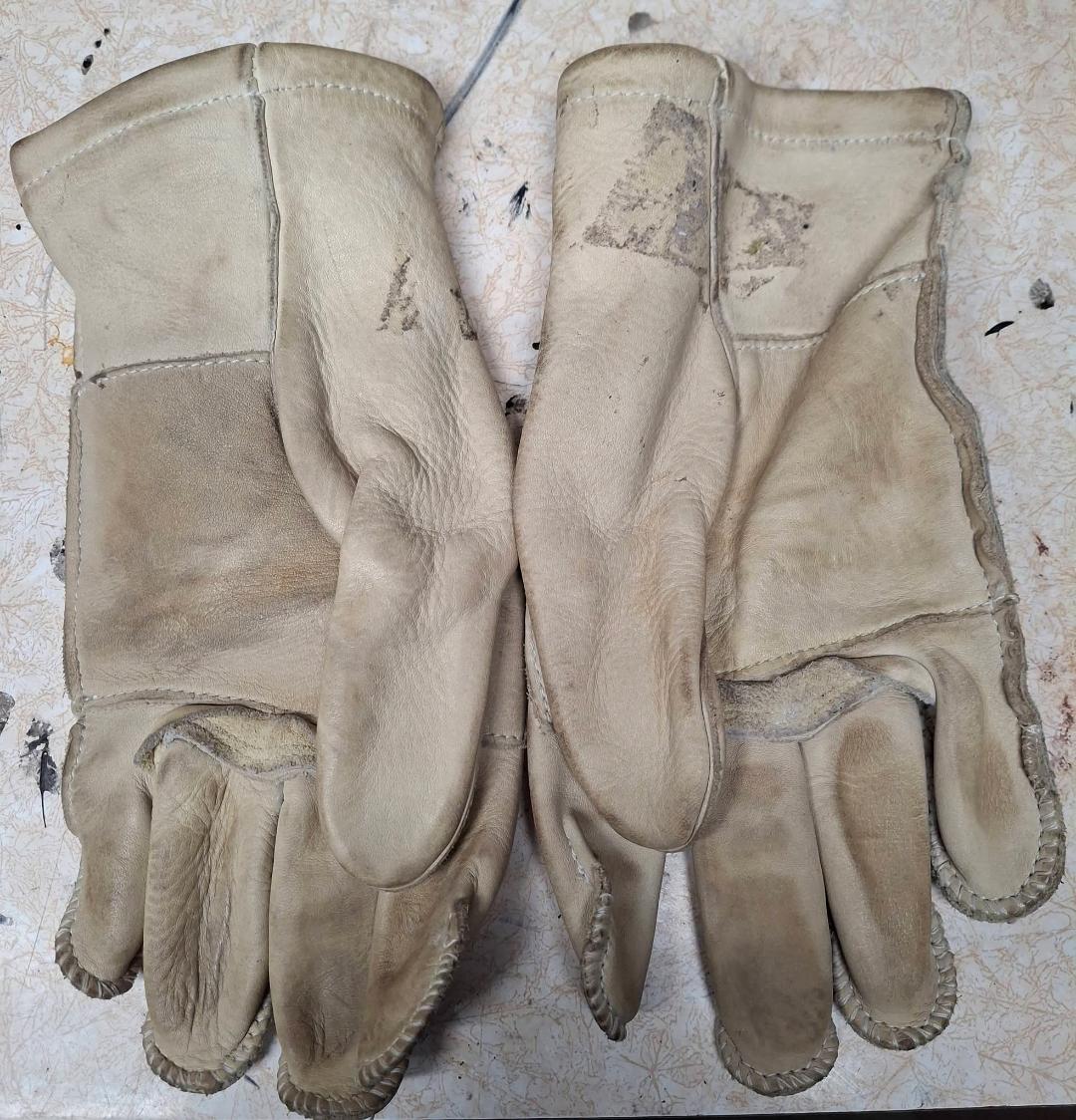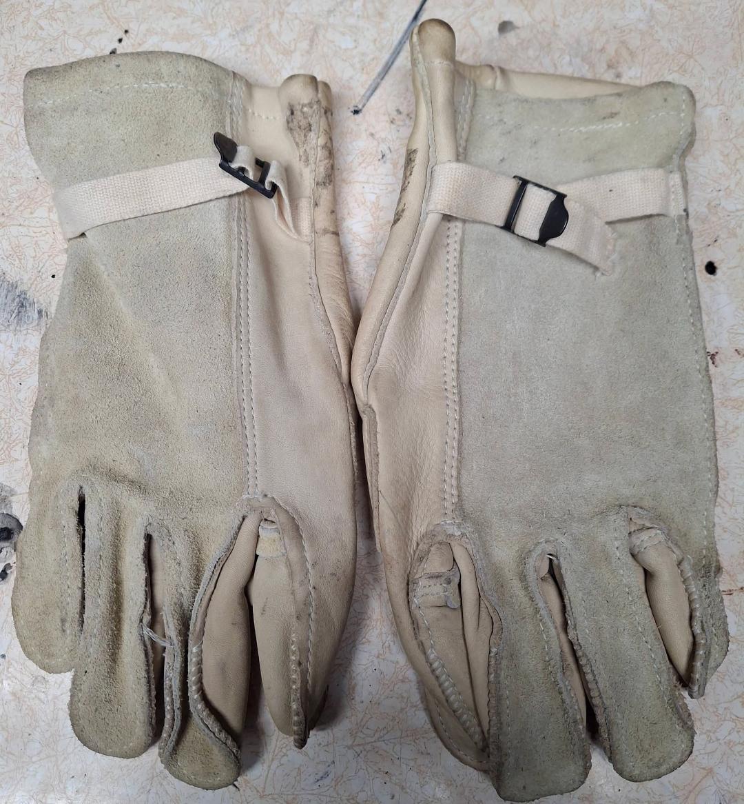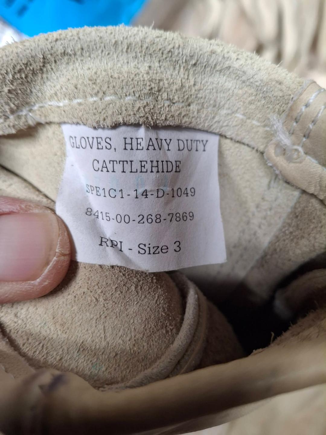 US GI Heavy Duty Cow Hide Leather Gloves. Used, good condition. Showing signs of use as in stains and marks but no holes or tears. Size 3 (small).