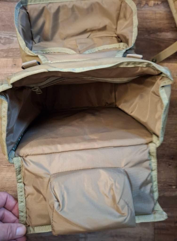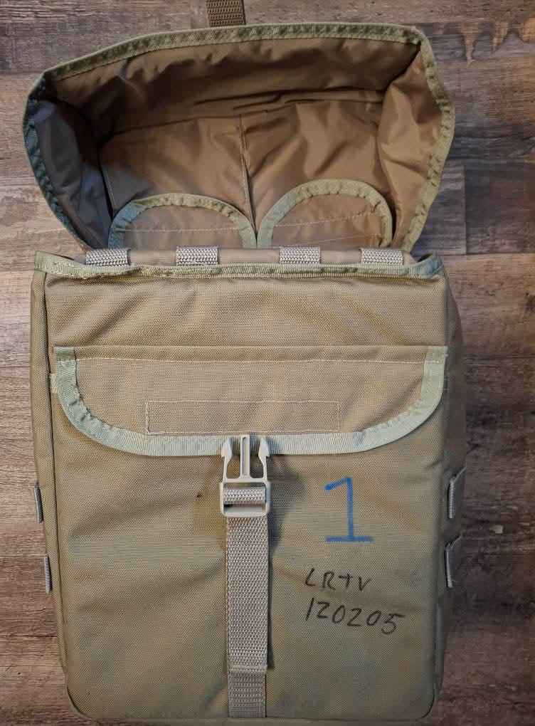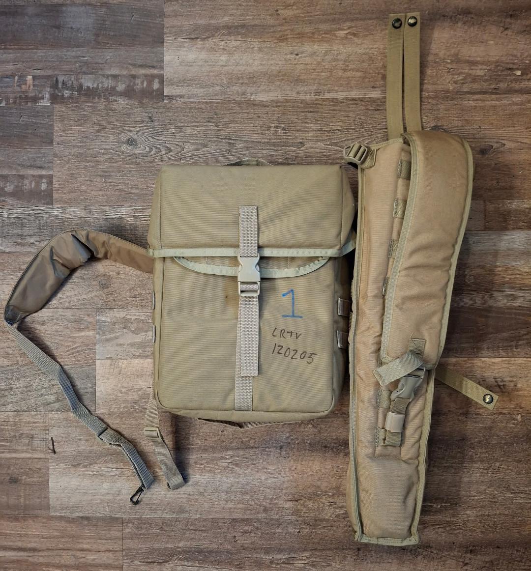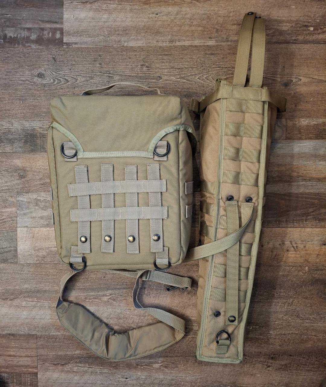 USMC Snipers Instruments Bag & Long Range Tripod Scabbard. Bag measures 14″ x 10″ x 6″ and can be attached to a ruck, plate carrier or chest rig, or carried with strap. Tripod scabbard measures 23″ x 7″ x 4″ and can be carried the same way. Set includes bag, scabbard and sling. Coyote color. Excellent condition.