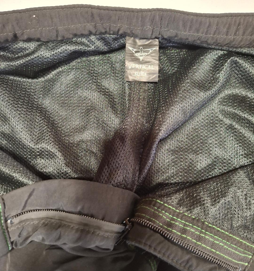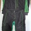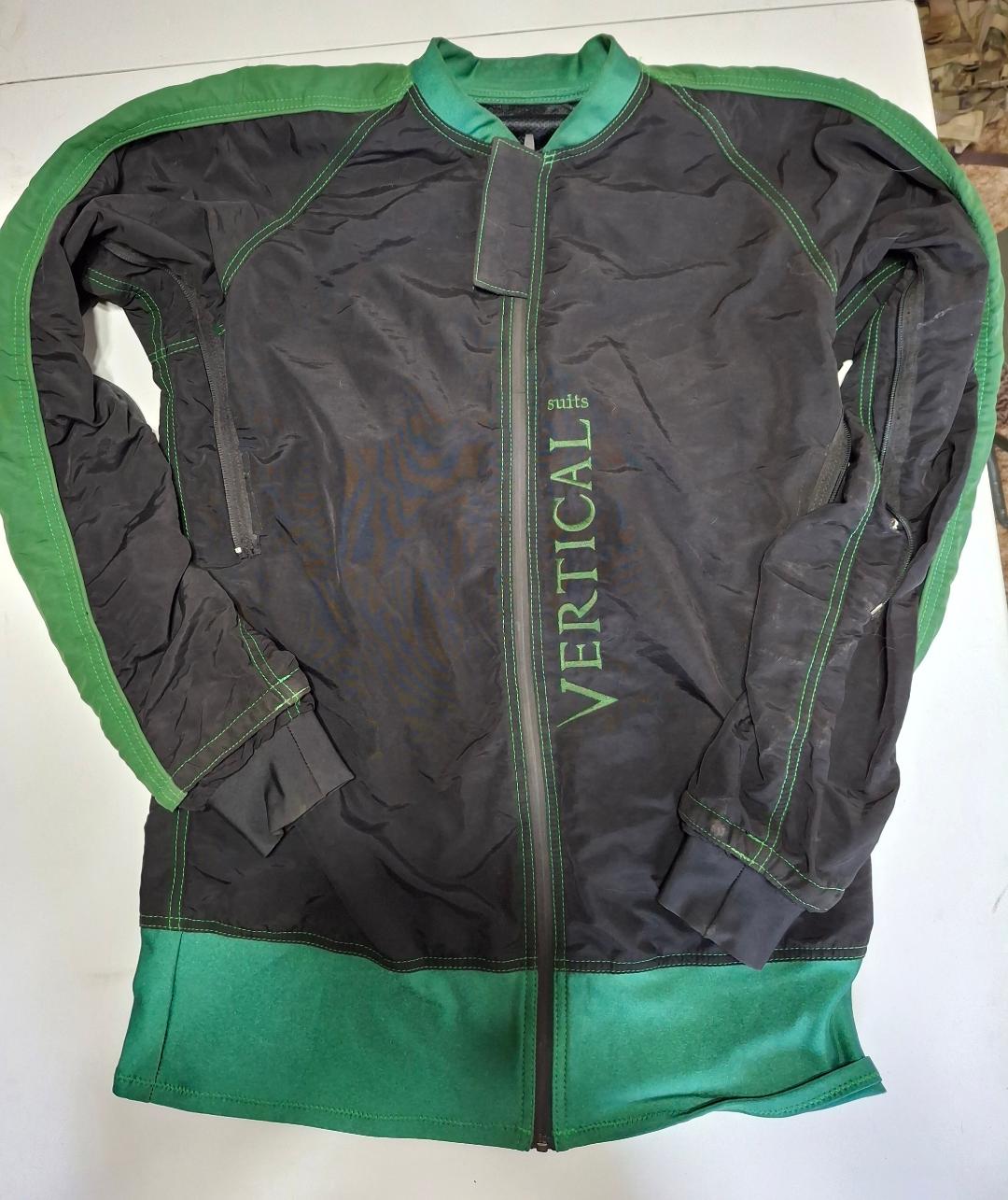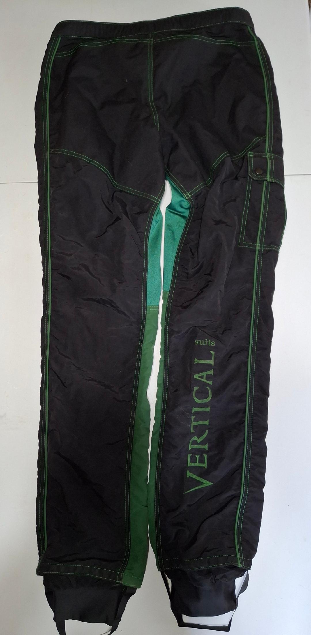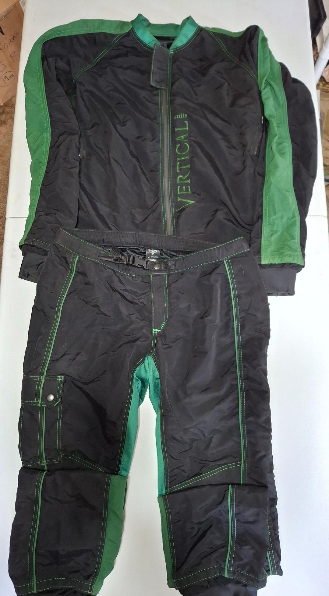 Vertical Suits Two-Piece Skydiving Suit. Very good condition. Black and green. No size markings, measurements are as follows. Jacket Pit to Pit 23.5″. Shoulder to Shoulder 20″. Shoulder to Cuff 25″. Colar to Waist 28″. Pants waist 36″, Inseam 34″. $100 for the set.