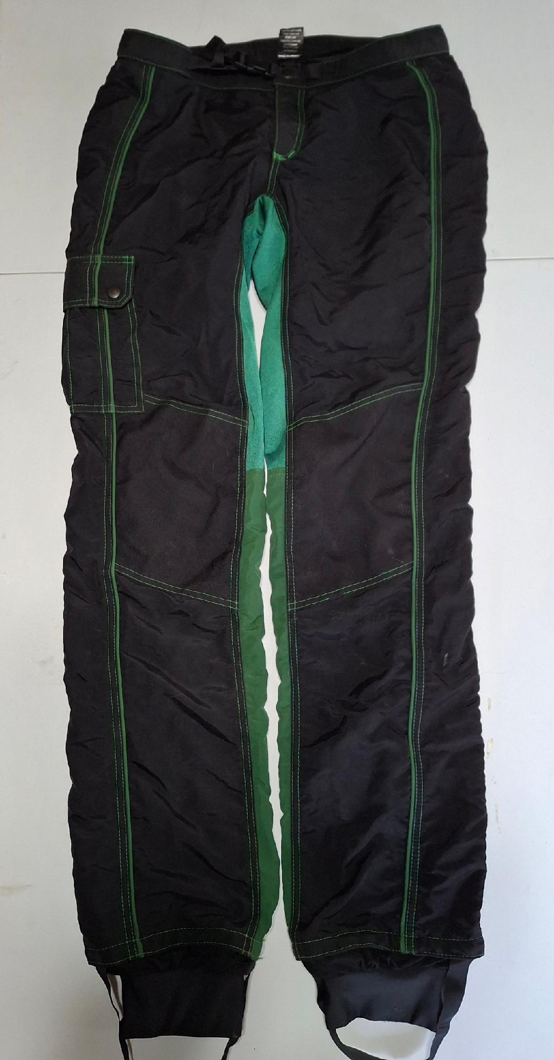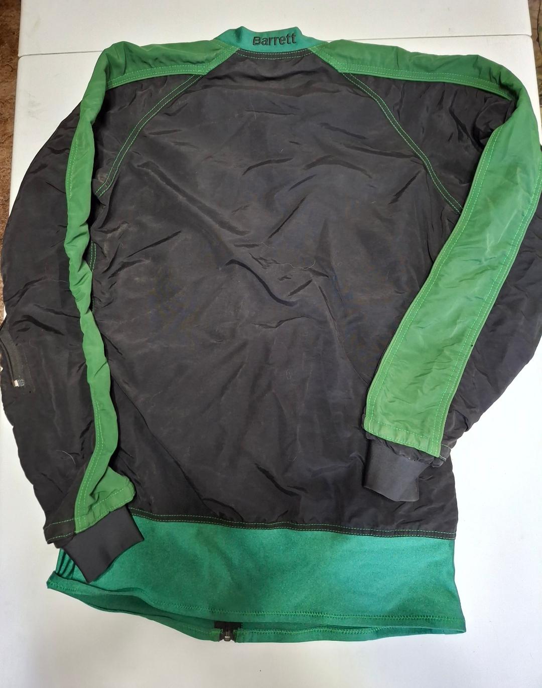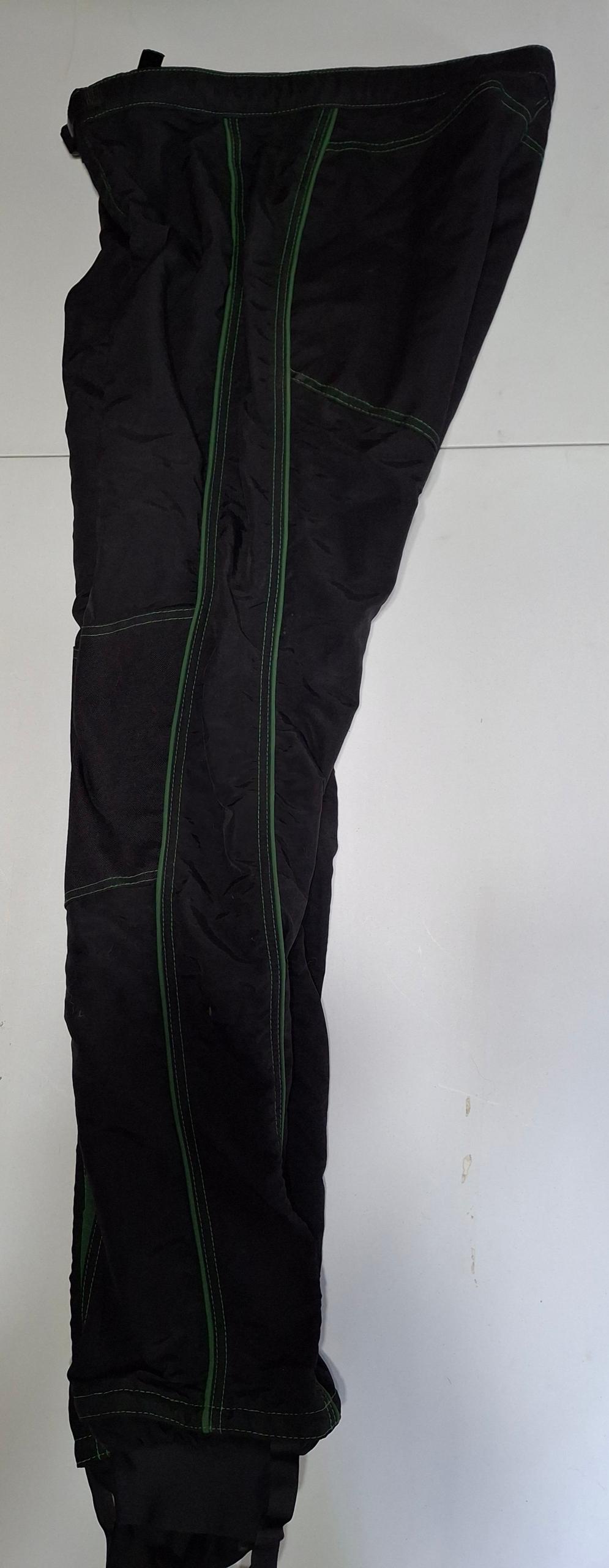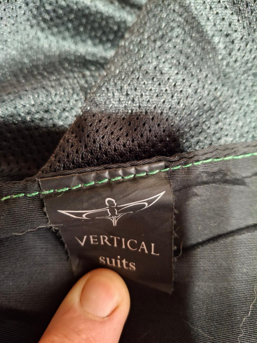 Vertical Suits Two-Piece Skydiving Suit. Very good condition. Black and green. No size markings, measurements are as follows. Jacket Pit to Pit 23.5″. Shoulder to Shoulder 20″. Shoulder to Cuff 25″. Colar to Waist 28″. Pants waist 36″, Inseam 34″. $100 for the set.